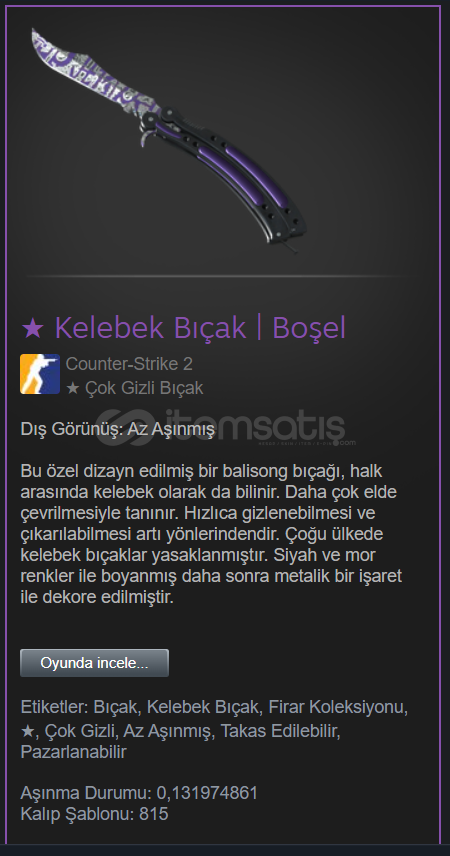 Bu özel dizayn edilmiş bir balisong bıçağı, halk arasında kelebek olarak da bilinir. Daha çok elde çevrilmesiyle tanınır. Hızlıca gizlenebilmesi ve çıkarılabilmesi artı yönlerindendir. Çoğu ülkede kelebek bıçaklar yasaklanmıştır. Siyah ve mor renkler ile boyanmış daha sonra metalik bir işaret ile dekore edilmiştir.