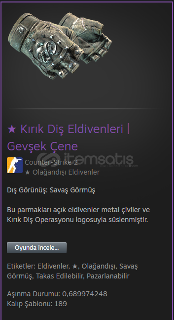 Tür : EldivenlerNitelik : ★Nadirlik : OlağandışıDış Görünüş : Savaş GörmüşBu parmakları açık eldivenler metal çiviler ve Kırık Diş Operasyonu logosuyla süslenmiştir.