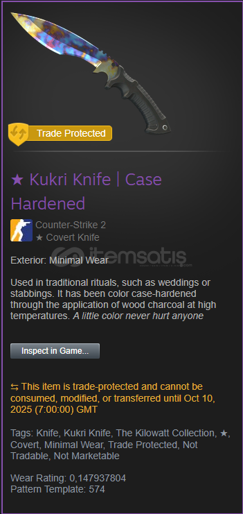 Dış Görünüm: Az Aşınmış Düğün veya bıçaklama gibi geleneksel ritüellerde kullanılır. Yüksek sıcaklıklarda odun kömürü uygulanarak rengi sertleştirilmiştir. Biraz renklendirmenin kimseye zararı olmaz. Wear Rating: 0,147937804Pattern Template: 574