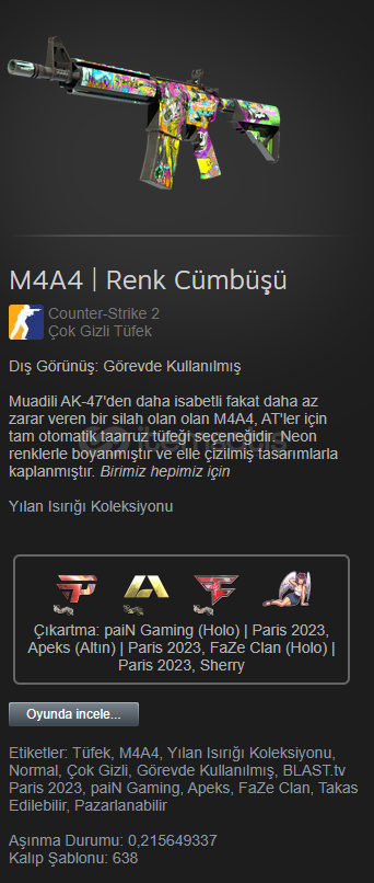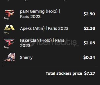 • Çıkartma: paiN Gaming (Holo) | Paris 2023, Apeks (Altın) | Paris 2023, FaZe Clan (Holo) | Paris 2023, Sherry