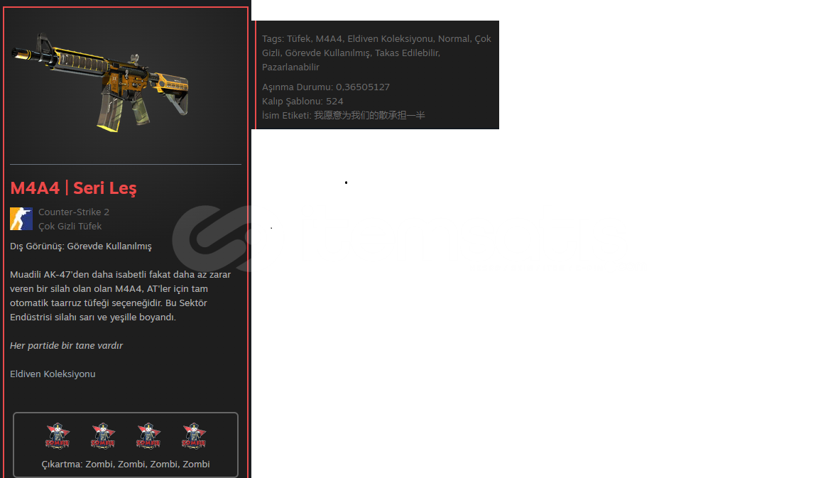 Muadili AK-47'den daha isabetli fakat daha az zarar veren bir silah olan olan M4A4, AT'ler için tam otomatik taarruz tüfeği seçeneğidir. Bu Sektör Endüstrisi silahı sarı ve yeşille boyandı.Aşınma Durumu: 0,36505127Kalıp Şablonu: 524İsim Etiketi: 我愿意为我们的散承担一半Çıkartma: Zombi, Zombi, Zombi, ZombiOyunda ince...