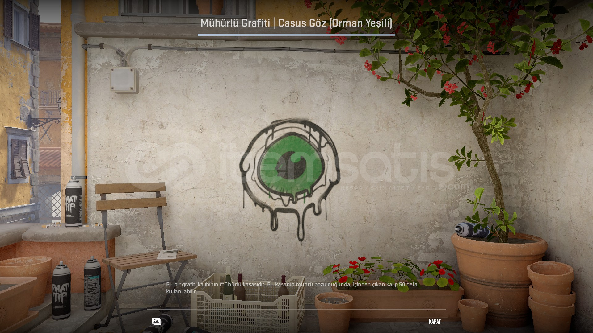 Mühürlü Grafiti | Casus Göz (Orman Yeşili)Steam hesabınızın envanter gizliliği, herkese açık olmalıdır.Steam hesabınızda trade banı olmamalıdır.Çevrimiçi olmamı beklemeden satın alabilirsiniz.Daha fazla ilan için mağazama göz atabilirsiniz.NOT!:Steam Guard eklediyseniz 15 gün, Steam adınızı değiştirdiyseniz 4 saat ban...