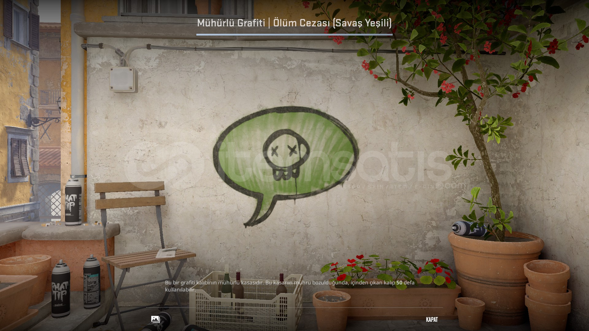 Mühürlü Grafiti | Ölüm Cezası (Savaş Yeşili)Steam hesabınızın envanter gizliliği, herkese açık olmalıdır.Steam hesabınızda trade banı olmamalıdır.Çevrimiçi olmamı beklemeden satın alabilirsiniz.Daha fazla ilan için mağazama göz atabilirsiniz.NOT!:Steam Guard eklediyseniz 15 gün, Steam adınızı değiştirdiyseniz 4...