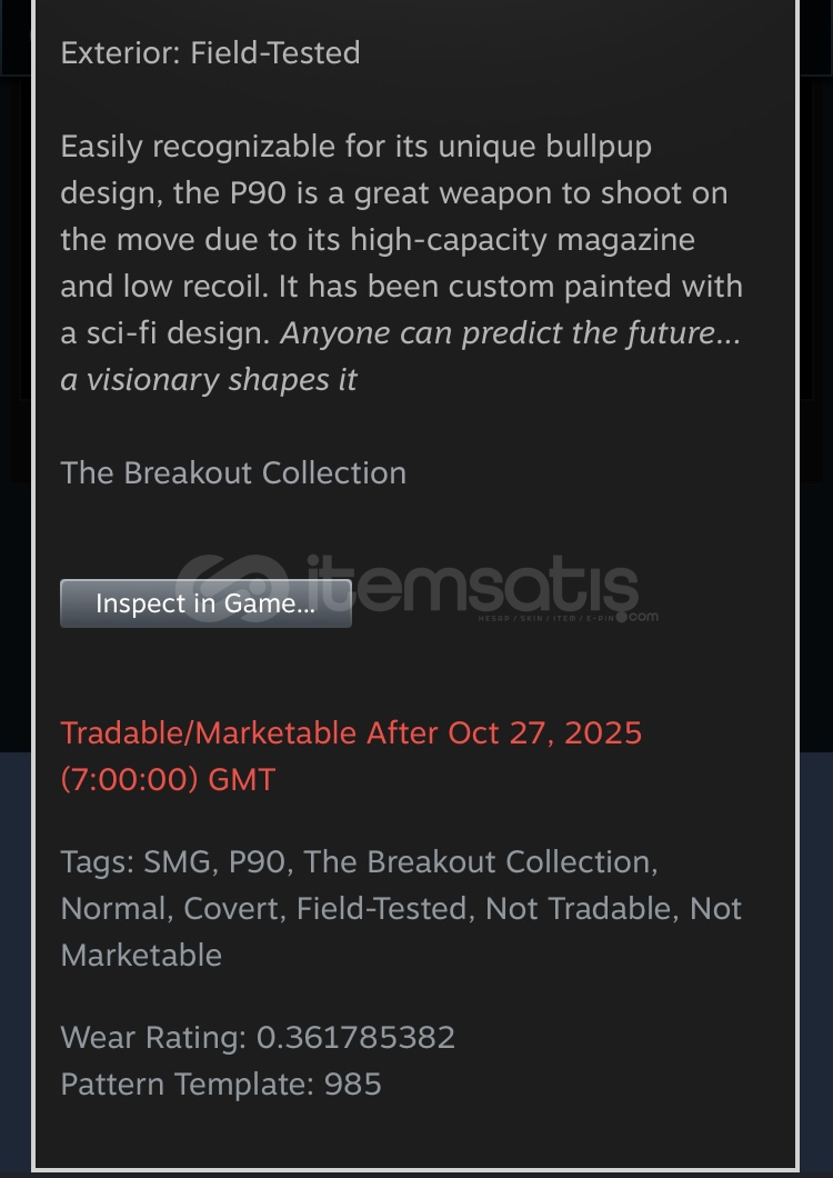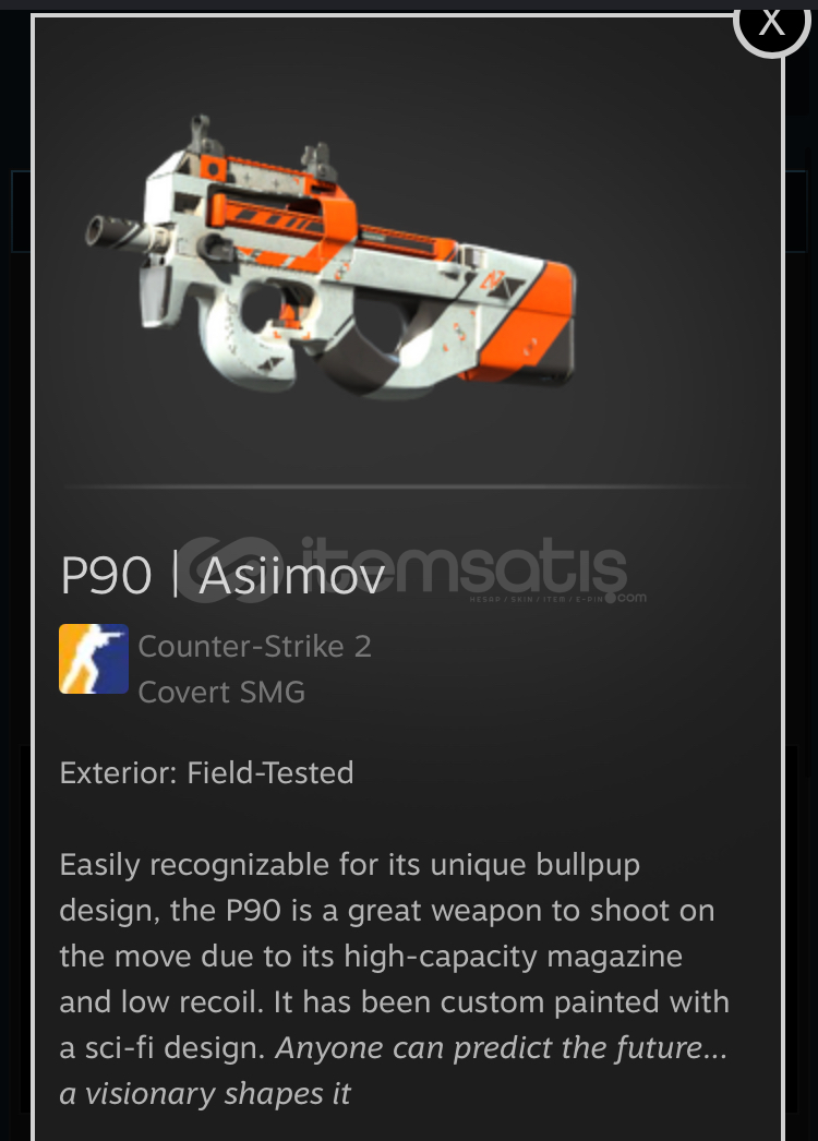 P90 asiimov görevde kullanılmış. İster kullanın ister benden ucuza alıp satarak daha ucuza hesap dizebilirsiniz. piyasa değeri 140 dolar civarıdır. Güvenle alabilirsiniz