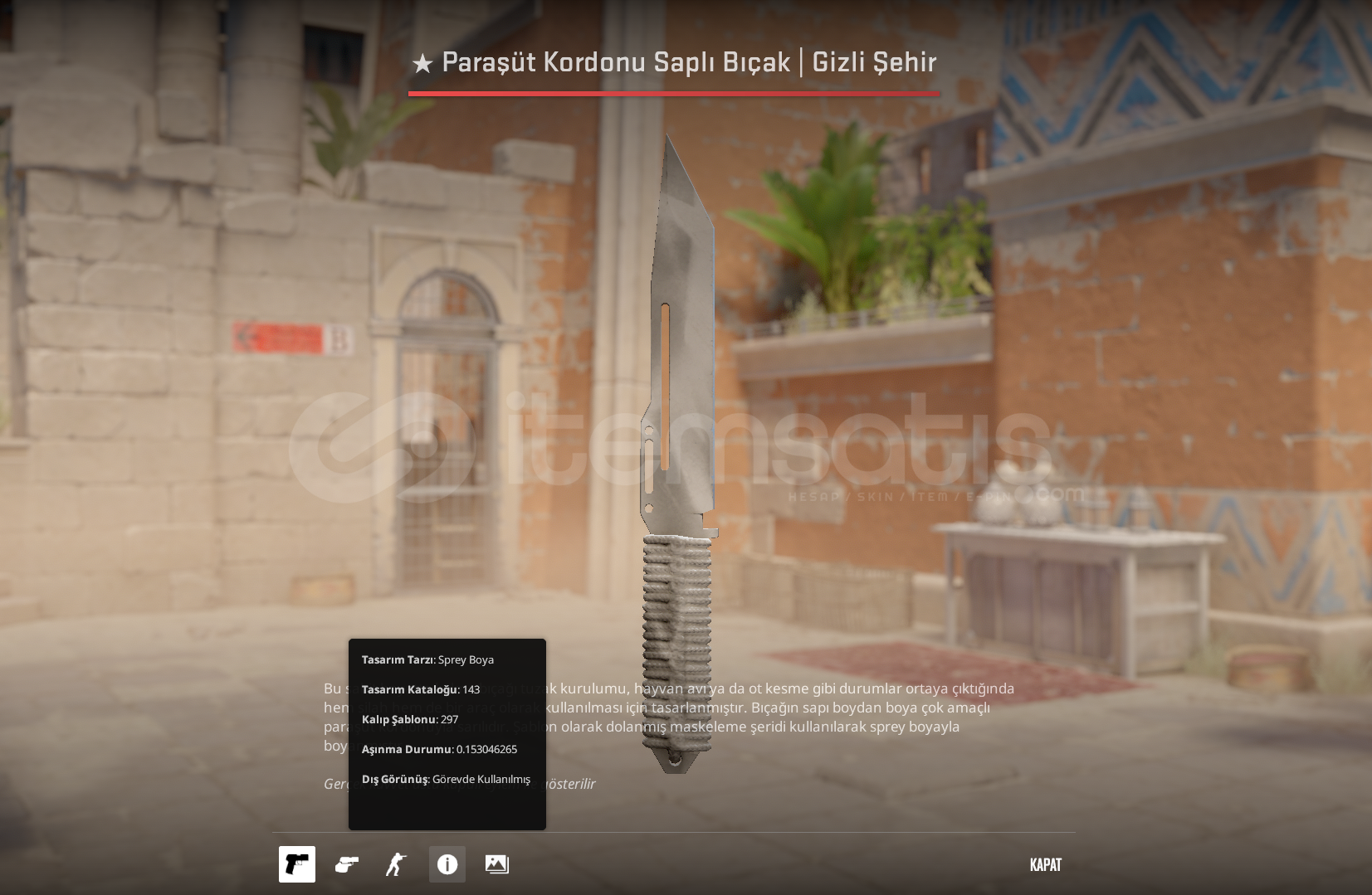 ★ Paraşüt Kordonu Saplı Bıçak | Gizli Şehir Dış Görünüş: Görevde KullanılmışKalıp Şablonu: 297Aşınma Durumu: 0,153046265