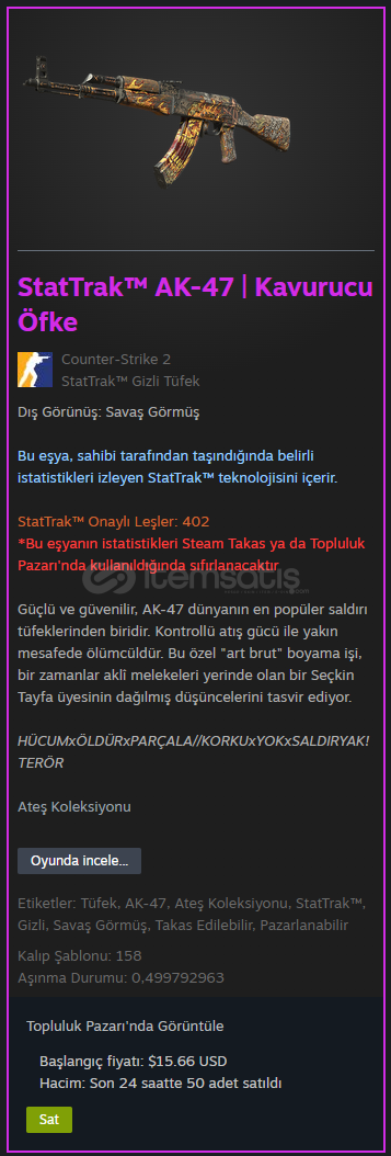 Tür : TüfekSilah : AK-47Koleksiyon : Ateş KoleksiyonuNitelik : StatTrak™Nadirlik : GizliDış Görünüş : Savaş GörmüşGüçlü ve güvenilir, AK-47 dünyanın en popüler saldırı tüfeklerinden biridir. Kontrollü atış gücü ile yakın mesafede ölümcüldür. Bu özel 'art brut' boyama işi, bir zamanlar aklî melekeleri yerinde o...