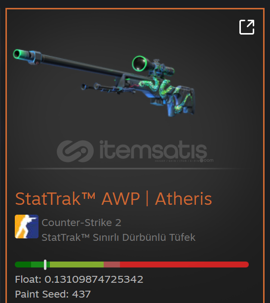StatTrak™ AWP | Atheris ÜZERİNDE 1 ADET STİCKER BULUNMAKTADIR. STİCKERIN DEĞERİ 1.10 DOLAR ETMEKTEDİR.Float: 0.13109874725342Paint Seed: 43712 saat içerisinde teslim. ( Aktif olduğum an teslimatı sağlarım. )SATIN ALMADAN ÖNCE MUTLAKA OKUYUNUZ!1- STEAM HESABINIZIN TRADE BANININ KESİNLİKLE OLMAMASI GEREKMEKTEDİR.2- STEAM HESABINIZIN ENVANTER GİZLİLİĞİ HERKESE AÇIK ...