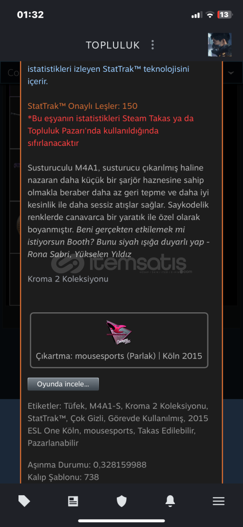 Stattrak M4a1-s Hiper canavar (görevde kullanılmış) 40 dolarlık sticker var üstünde