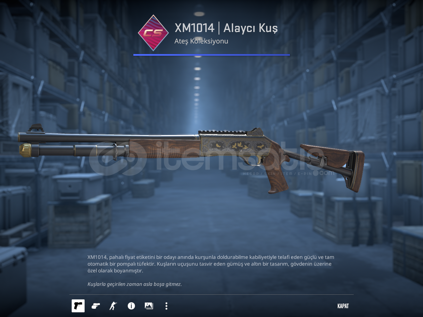 XM1014, pahalı fiyat etiketini bir odayı anında kurşunla doldurabilme kabiliyetiyle telafi eden güçlü ve tam otomatik bir pompalı tüfektir. Kuşların uçuşunu tasvir eden gümüş ve altın bir tasarım, gövdenin üzerine özel olarak boyanmıştır. Kuşlarla geçirilen zaman asla boşa gitmez.