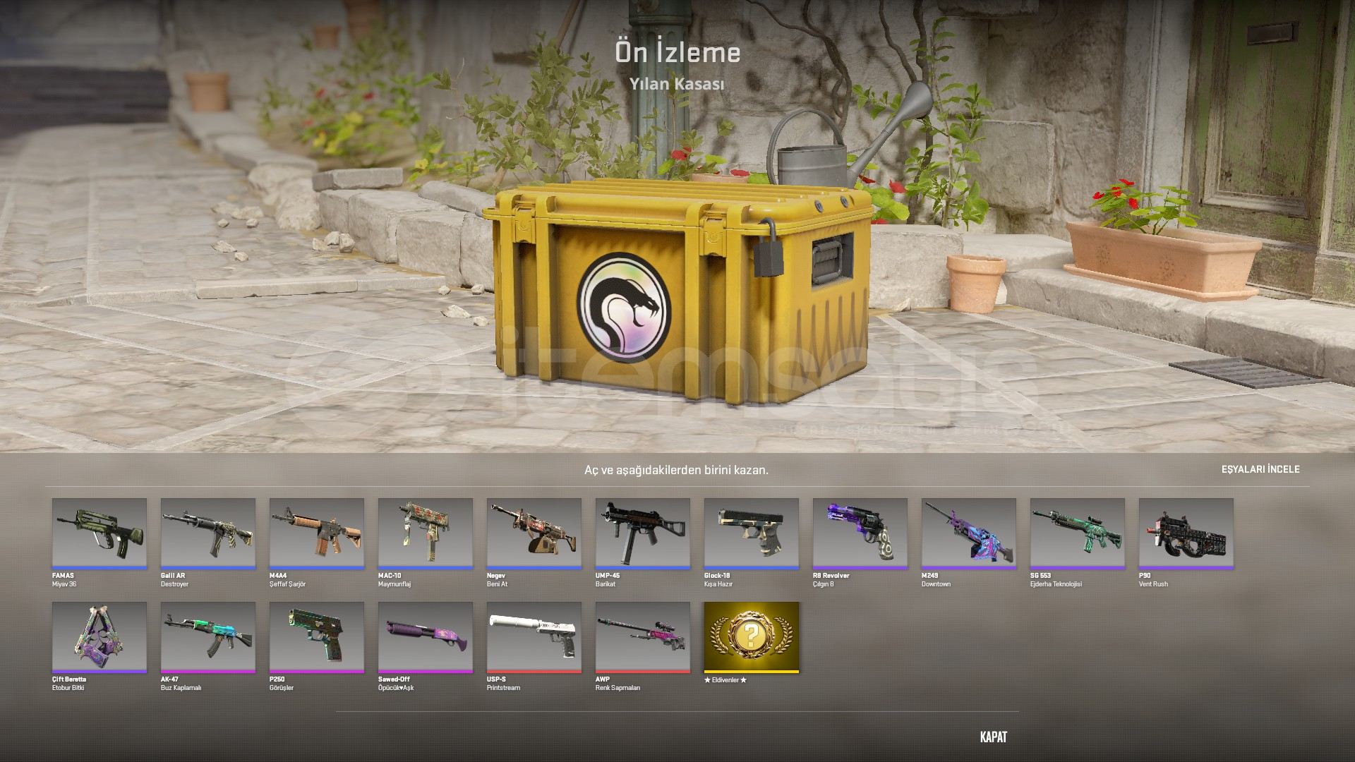Yılan KasasıSteam hesabınızın envanter gizliliği, herkese açık olmalıdır.Steam hesabınızda trade banı olmamalıdır.Çevrimiçi olmamı beklemeden satın alabilirsiniz.Daha fazla ilan için mağazama göz atabilirsiniz.NOT!:Steam Guard eklediyseniz 15 gün, Steam adınızı değiştirdiyseniz 4 saat banınız olur.