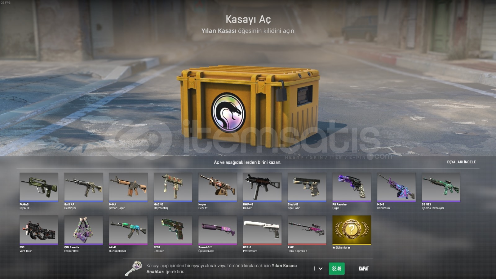 Yılan KasasıCounter-Strike 2Temel Sınıf Kasa Kasa Serisi #355 Aşağıdaki eşyalardan birini içerir:FAMAS | Miyav 36Galil AR | DestroyerM4A4 | Şeffaf ŞarjörMAC-10 | MaymunflajNegev | Beni AtUMP-45 | BarikatGlock-18 | Kışa HazırR8 Revolver | Çılgın 8M249 | DowntownSG 553 | Ejderha TeknolojisiP90 | Vent RushÇift Beretta | Etobur BitkiAK-47 | Buz KaplamalıP250 | GörüşlerSa...