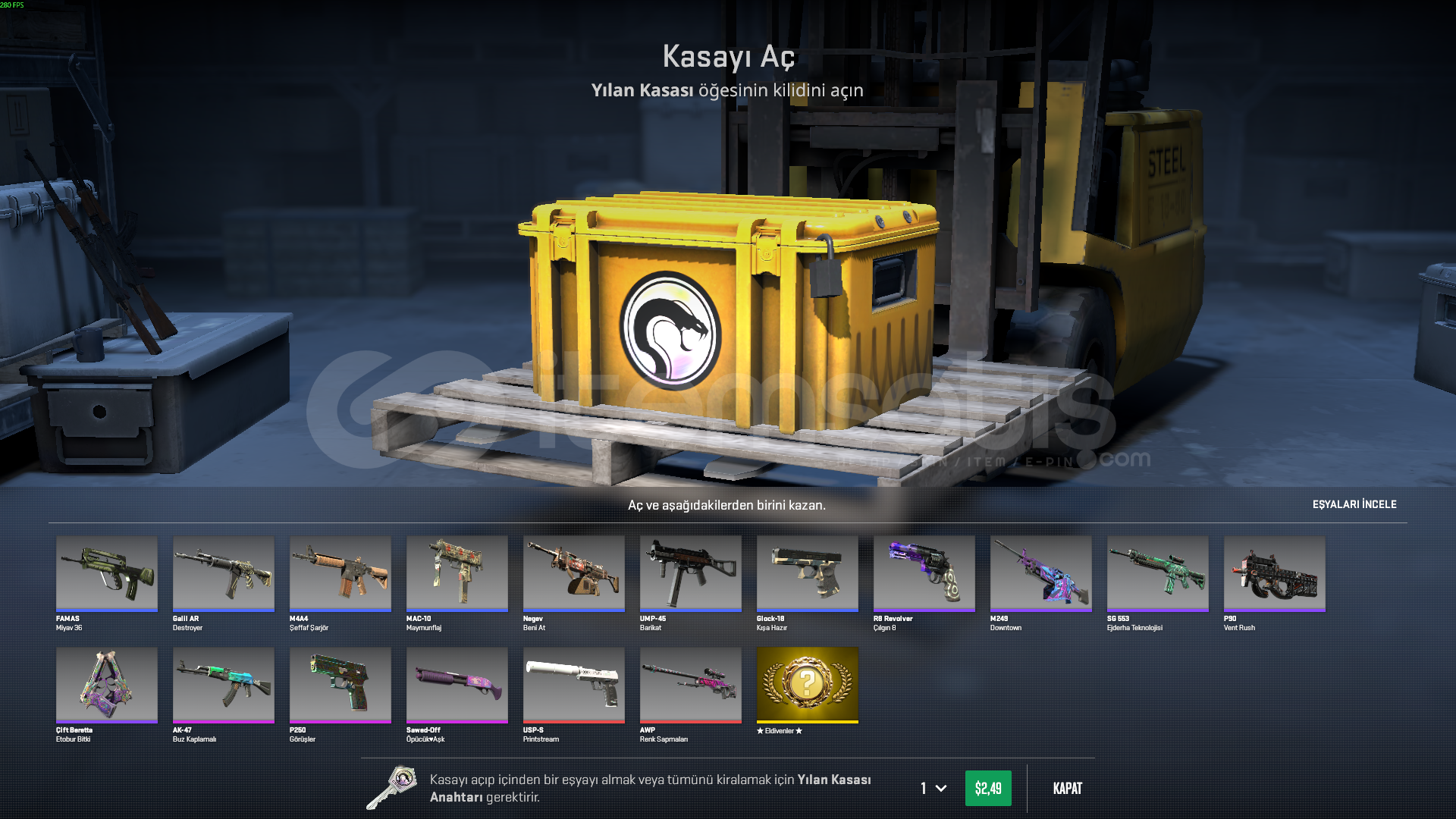 almadan önce steam arkadaşlık kodunu göndermeyi unutmayınız lütfenAşağıdaki eşyalardan birini içerir:FAMAS | Miyav 36Galil AR | DestroyerM4A4 | Şeffaf ŞarjörMAC-10 | MaymunflajNegev | Beni AtUMP-45 | BarikatGlock-18 | Kışa HazırR8 Revolver | Çılgın 8M249 | DowntownSG 553 | Ejderha TeknolojisiP90 | Vent RushÇift Beretta | Etobur BitkiAK-47 | Buz KaplamalıP250 | Görü&#...
