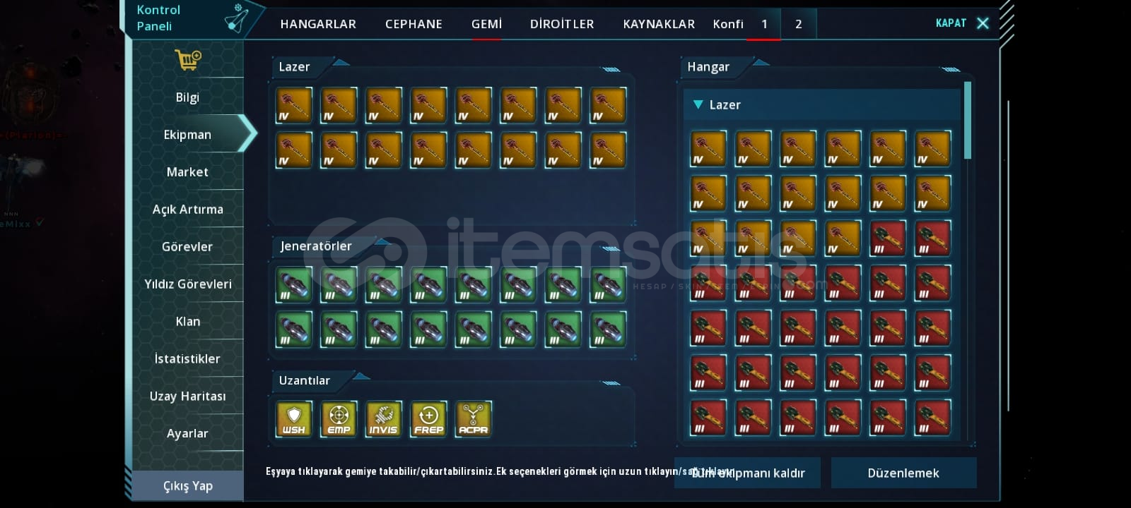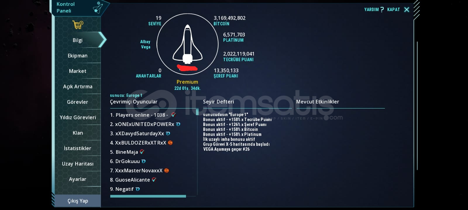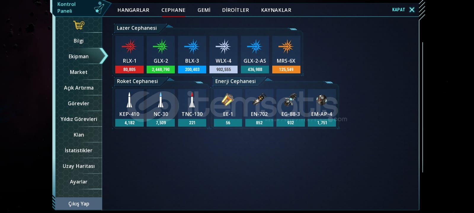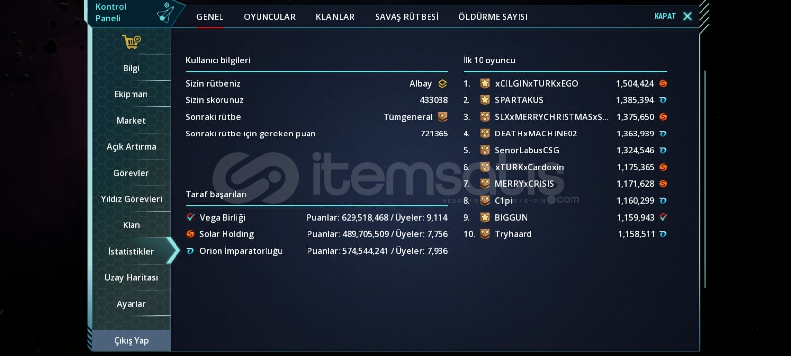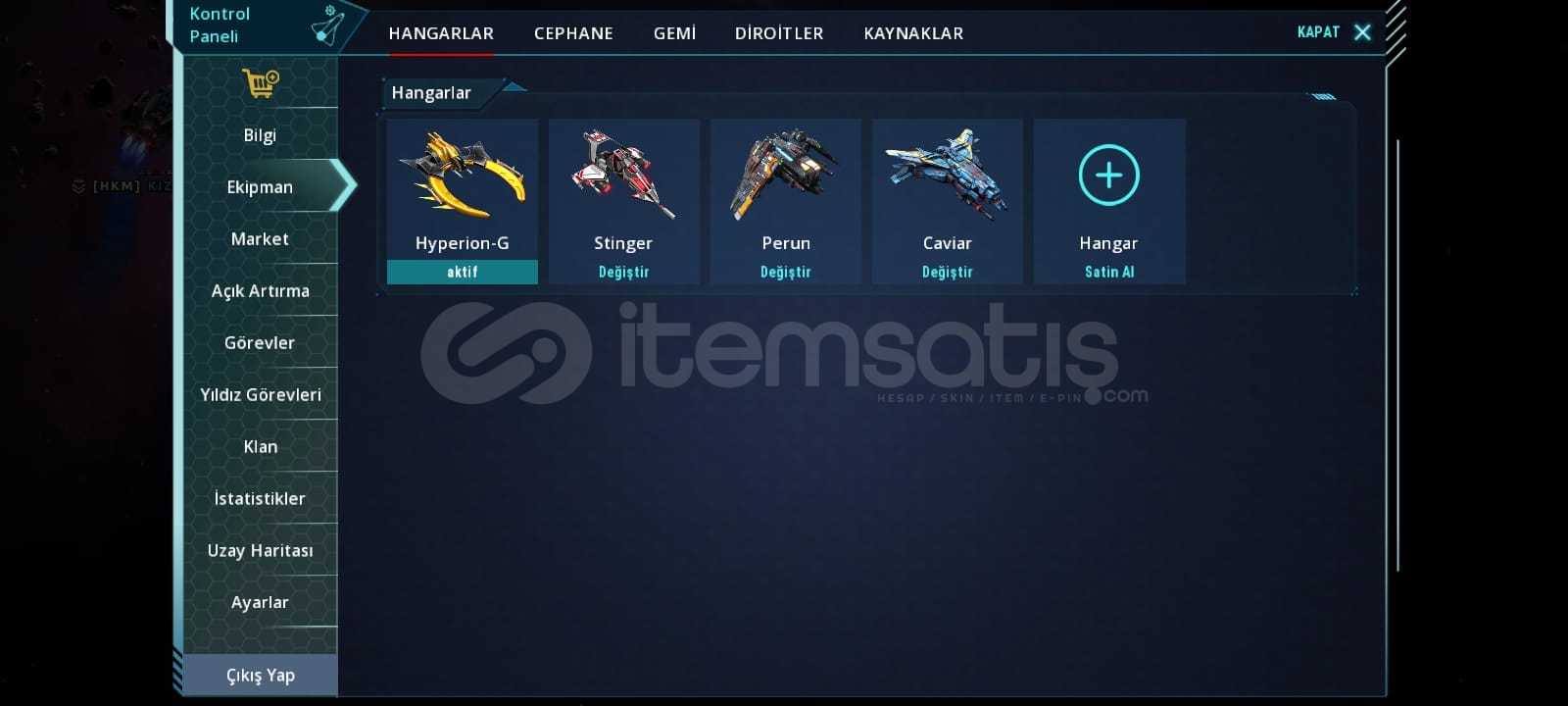 19 level, Albay rütbe32 lg4 2milyar tp.13 milyon şeref.4 hangar. Hyperion-g, Perun, Caviar, St6.5m plt900k x4 cephane6 mavi 5 kırmı...