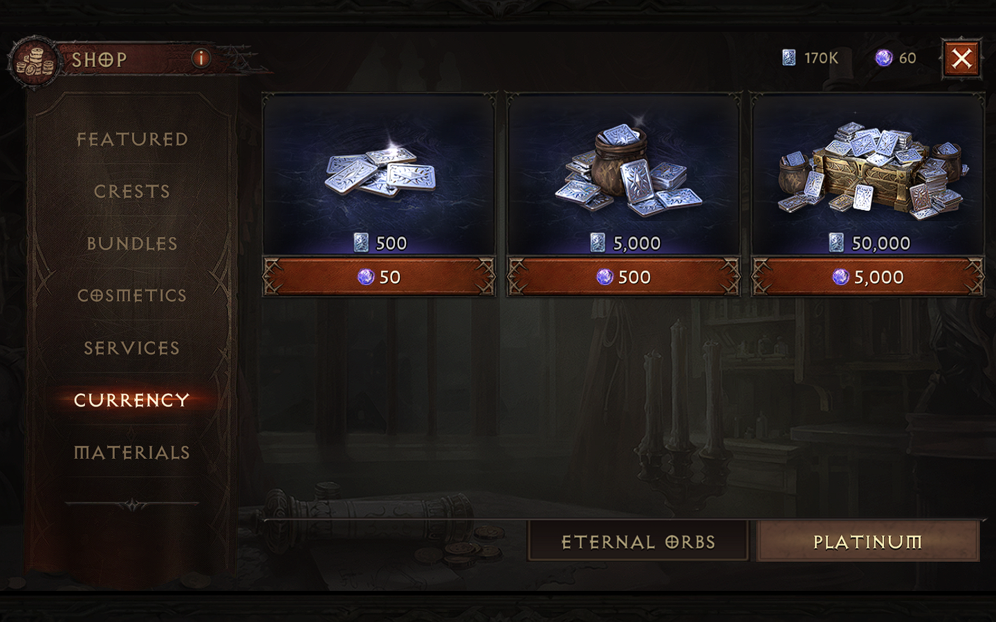 Diablo Immortal The Butcher server'ında 170k Platinum satılır. 170k Platinum = 2700 TL