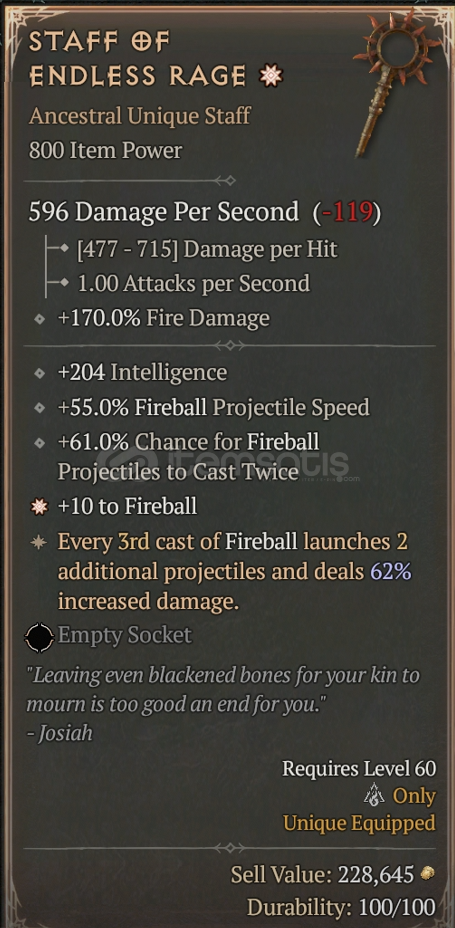 Staff of Endless Rage[ 170% ] Fire Damage[ 204 ] Intelligence[ 61% ] Chance for Fireball Projectiles to Cast Twice[ 55% ] Fireball Projectile Speed...
