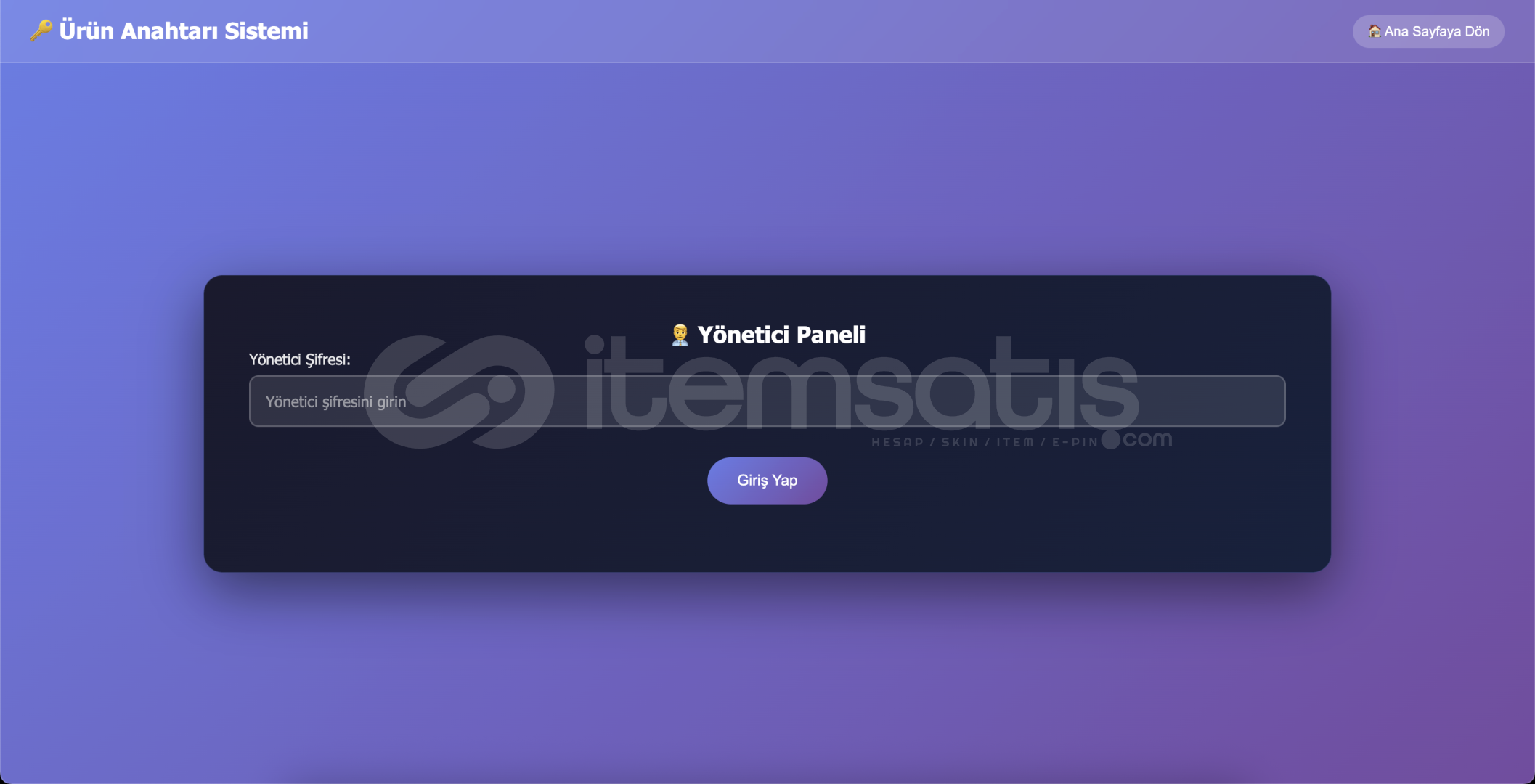 🚀 Profesyonel Ürün Anahtarı Yönetim Sistemi Sistem üzerinden ürün ekle, kaldır, düzenle ve tek tıkla yönet!✅ Anahtar Gir – Anınd.a Ürün Teslimi Ürün anahtarını giren kullanıcı, kaydedilen ürünü otomatik olarak teslim alır.👨‍💼 Yönetici Paneli Özellikleri:🔑 Ürün ekleme / silme / düzenleme📊 Ür&uu...