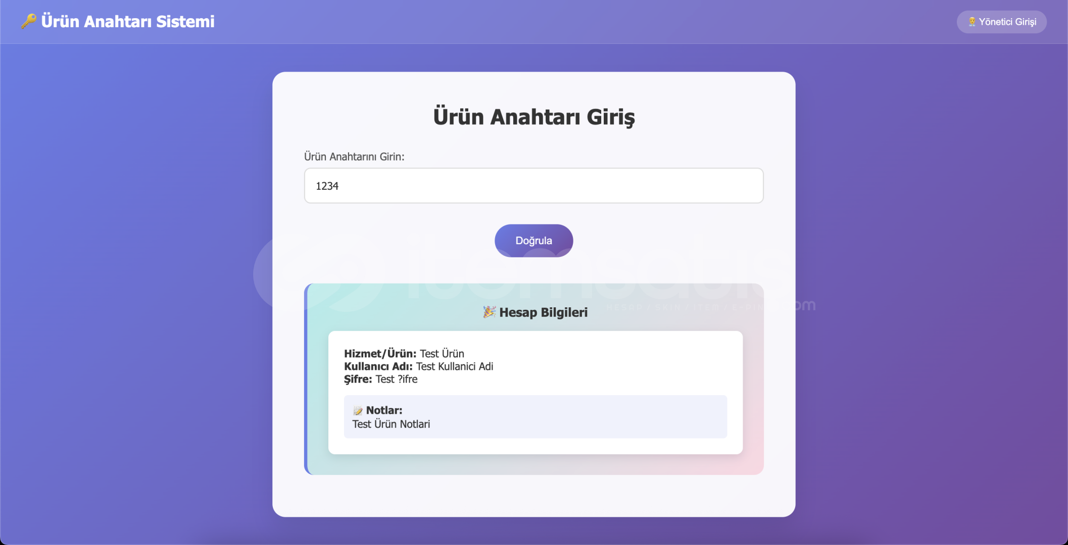 ⚠️ Not: Yukarıdaki bilgiler sadece sistemi denemek içindir. Gerçe.k kullanım için size özel lisanslı anahtar verilecektir.