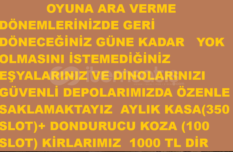 EK NOT : OYUNA ARA VERME DÖNEMLERİNİZDE GERİ DÖNECEĞİNİZ GÜNE KADAR YOK OLMASINI İSTEMEDİĞİNİZ EŞYALARINIZ VE DİNOLARINIZI GÜVENLİ DEPOLARIMIZDA ÖZENLE SAKLAMAKTAYIZ AYLIK KASA(350 SLOT)+ DONDURUCU KOZA (100 SLOT)AYLIK KİRLARIMIZ 1000 TL DİR .