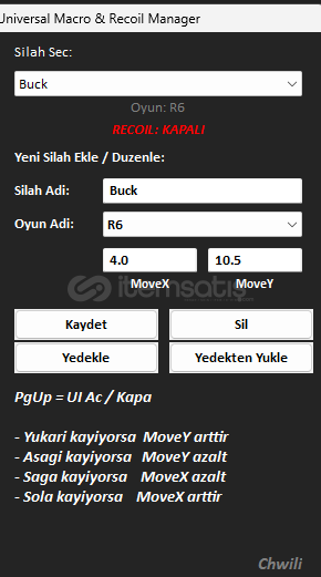 Universal Recoil Manager, FPS oyuncuları için tasarlanmış profesyonel bir geri tepme (recoil) dengeleme aracıdır.Valorant, CS2, R6, Apex, PUBG, Battlefield ve benzeri tüm oyunlarda %100 uyumlu çalışır.Hiçbir özel mouse veya marka gerekmez.Tamamen yazılımsal olarak çalışır — Logitech, Razer, Bloody ya da A4Tech fark etmez.Sistem doğrudan girdi katmanını kullanır, yani r...