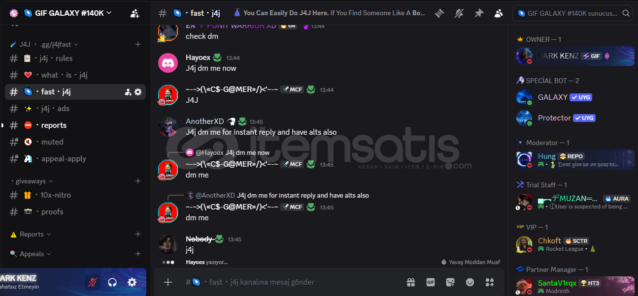 ➔ AKTİF DEĞİLKEN ALABİLİRSİNİZ➔ Aldıktan sonra iade talep edilemez.➔ RİSKSİZ BİR ŞEKİLDE SUNUCUNUZ GERÇEK ÜYELER İLE BÜYÜR➔ Welcome Ping: Sunucunuz, üyelerinizi alana kadar kanalınıza giren üyelere etiket atılacaktir.➔ Sunucu aktif bir sunucudur ve 135.000 üyedir. +14 Boostu vardır.➔ @Everyone etiket Etiketlenecekt...