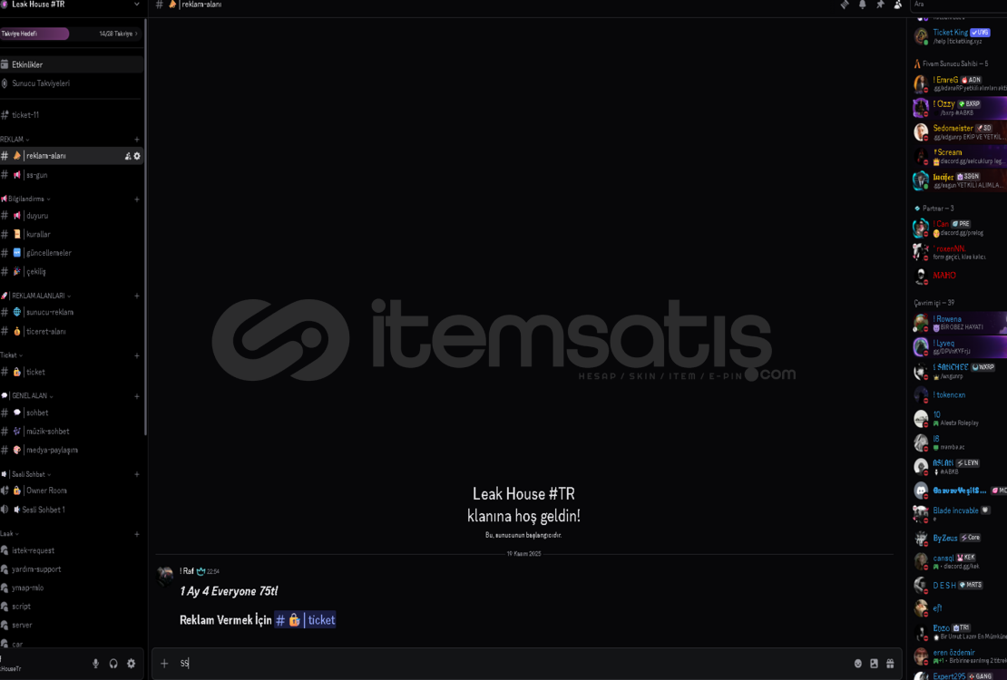 LeakHouseTR üzerinden yapacağınız reklam ile 1 ay boyunca haftada 4 kez @everyone atılır!