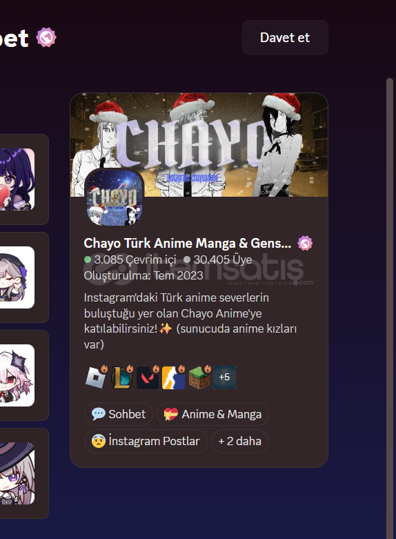 Türkiye'nin en iyi anime sunucularından Chayo'da reklam 2 haftalık özel kanal açılır ve everyone geçilir sizin isteğinize bağlı şekillendirilebilir (burdan ulaşamazsanız discorddan bana yazıp cevap verebilirim direkt)