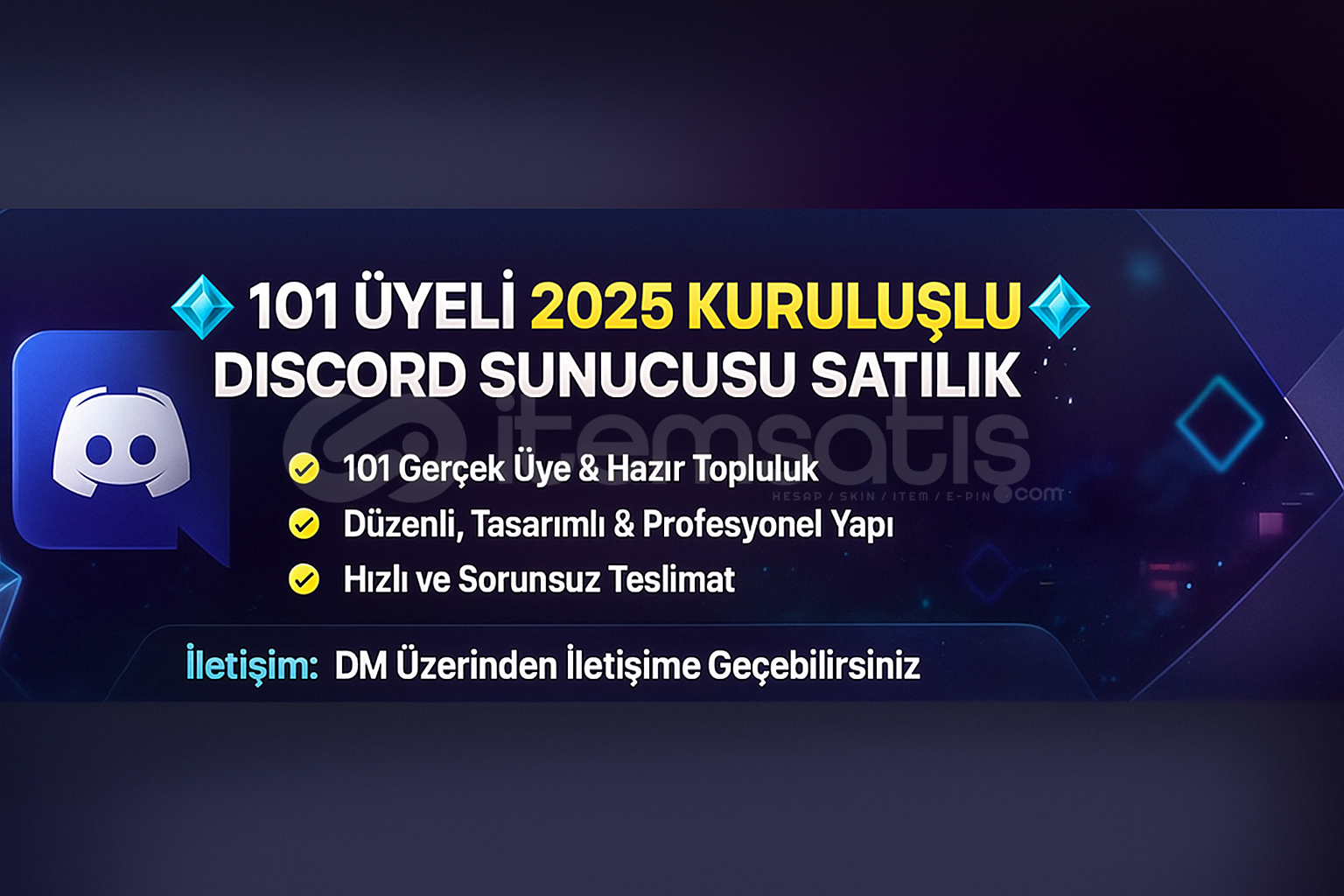 ✨ PREMİYUM DISCORD SUNUCU SATIŞI ✨ 15 Temmuz 2025 tarihinde kurulmuş olan, 101 üyeli tamamen oturmuş ve düzenli bir Discord sunucusunu devrediyorum. Sunucu, hem tasarım hem düzen hem de işlevsellik açısından hazır bir topluluk yapısına sahiptir. Yeni sahibine hiçbir ek uğraş bırakmadan, direkt kullanıma uygun şekilde teslim edilir.💎 Sunucu Özellikleri • 101...