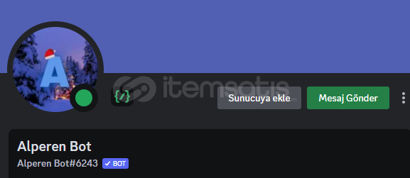 davet linki - https://top.gg/tr/bot/79625573850690357296 Komutu vardır. bağlantı tıklayarak daha detaylı bakabilirsiniz.🔐 Güvenlik/account-protection, /ad-block, /forbidden-word, /swear-block, /capslock-protection, /visual-block, /captcha-system👮 Moderasyon/ban, /kick, /mute, /timeout, /unban, /clear-channel, /slow-mode, /log, /mod-log, /channel-lock👥 Rol & Kayıt/auto-role, /button-role, /role-ver, /role-list, /register-system, /auto-tag...
