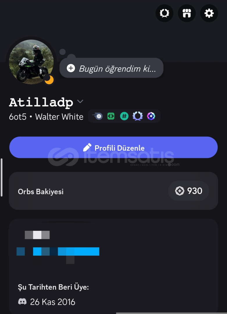 hesap 2016 yılında kuruldu5 aktif rozeti var4 haneli kullanıcı adı bulunmaktadır1 ay basit nitro+1 ay nitro açık(kredisi aktif basic bitince otomatik açılacaktır)hesap durumu gayet iyidir çok az kullanıldı hesaphesabın her şeyi devredilecektir.