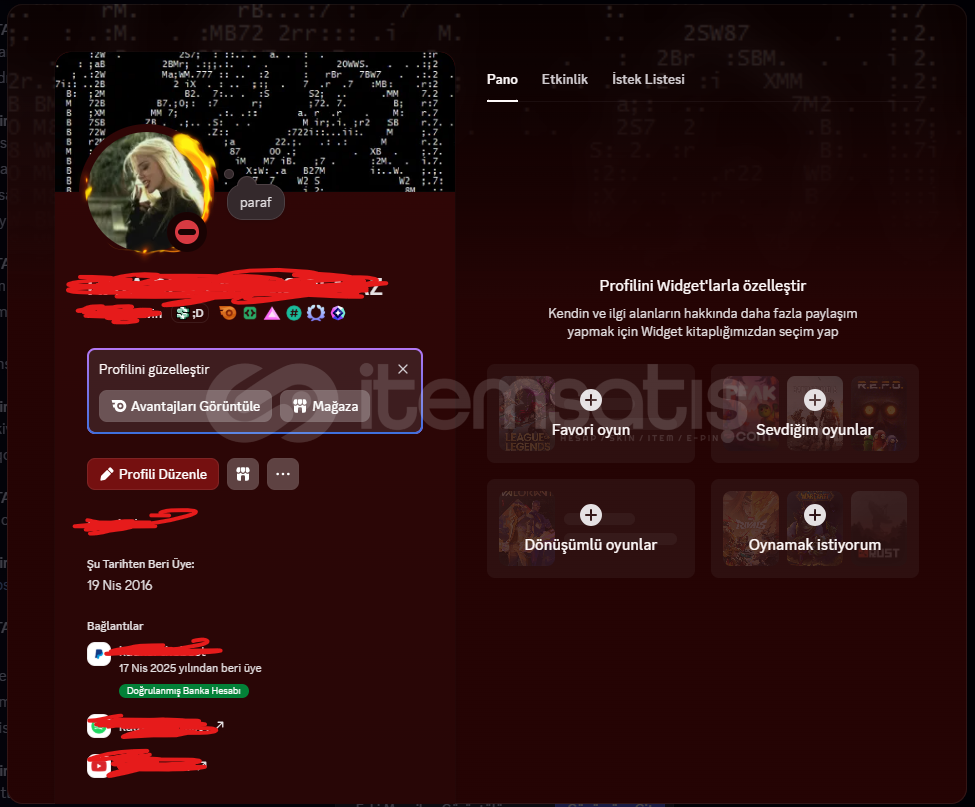 Hesap 2016 kurulumdur 4 aylık nitrosu mevcut ve bir sürü badgesi mevcut tüm bilgilerini değiştirebilirsiniz3 tane avatarı mevcuttur