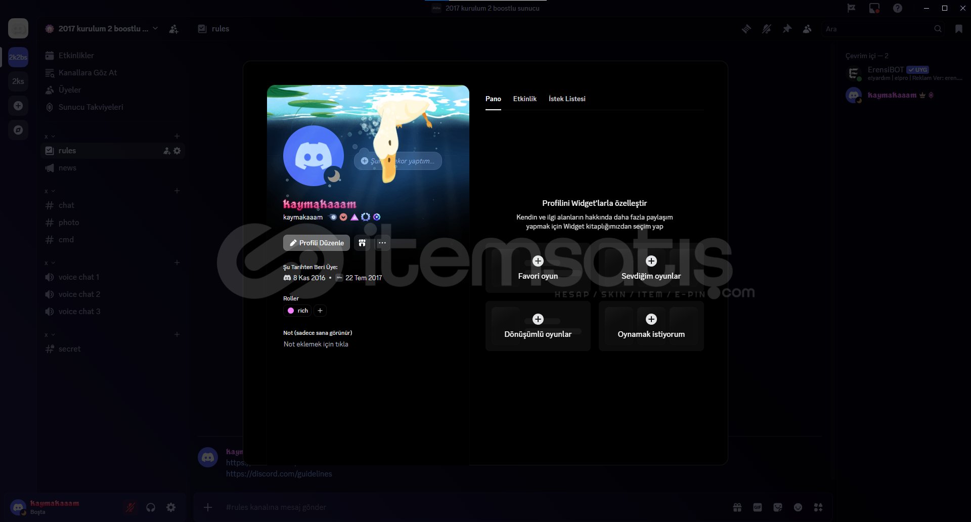 2016 Kurulumluİhlalsiz1 adet profil efektiDm,Sunucu,Arkadaşlar temizlenmiş şekilde2 Adet 2017 kurulum taçlı sunucu,1 tanesi 2 boostlu olarak verilecekHerşeyi değişen5 RozetliÇok uyguna verilecektir bu fırsatı kaçıran pişman!!