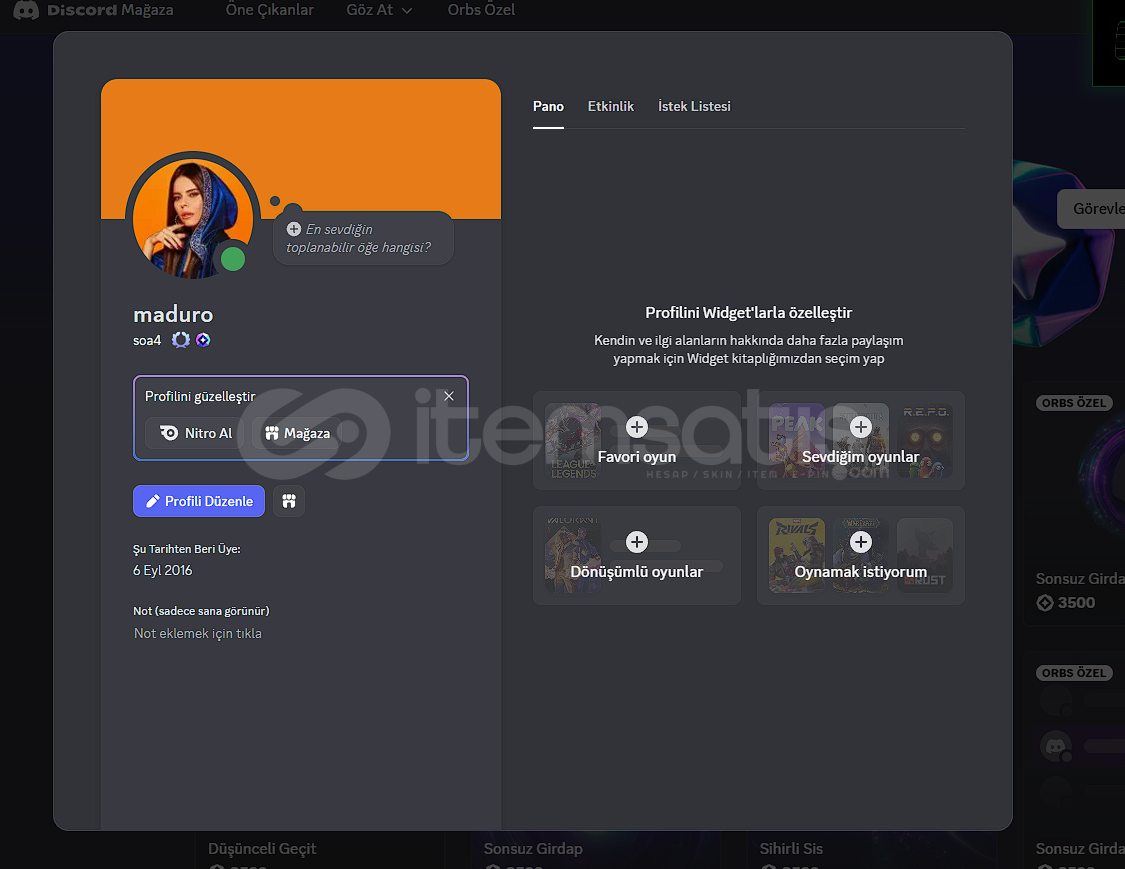 DISCORD HESAPÜrünü tamamen direkt teslimattır.ÜRÜN HAKKINDA BİLGİLERKullanıcı adı: soa4Hesap 2016 kurulumdur.Telefon ile doğrulanmamıştır.Herhangi bir problem yaşanmaması için satın alırken video kaydı almanız gerekmektedir.Bu ilanı satın aldıktan sonra bu açıklamayı okumuş kabul e...