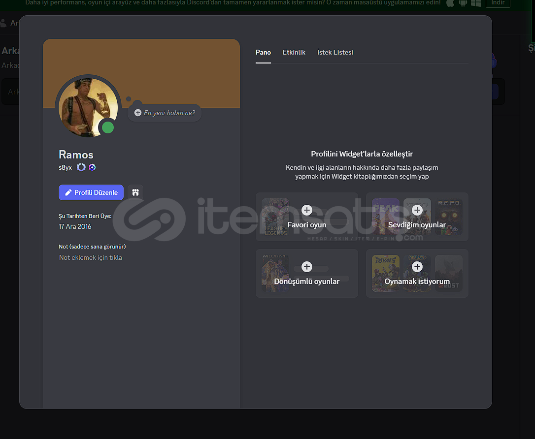 DISCORD HESAPÜrünü tamamen direkt teslimattır.ÜRÜN HAKKINDA BİLGİLERKullanıcı adı: s8yxHesap 2016 kurulumdur.Telefon ile doğrulanmamıştır.Herhangi bir problem yaşanmaması için satın alırken video kaydı almanız gerekmektedir.Bu ilanı satın aldıktan sonra bu açıklamayı okumuş kabul e...
