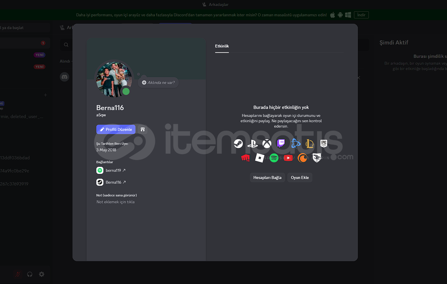 4 HANE + 2017 KURULUM DISCORD HESAPÜrünü tamamen direkt teslimattır.ÜRÜN HAKKINDA BİLGİLERKullanıcı adı: n3qfHesap 2018 kurulumdur.Hesapta şuanda tüm hesaplarda olmayan Pano özelliği vardır.Telefon ile doğrulanmamıştır.Herhangi bir problem yaşanmaması için satın alırken video kaydı almanız gerekmektedir.Bu ilanı s...