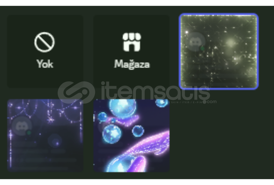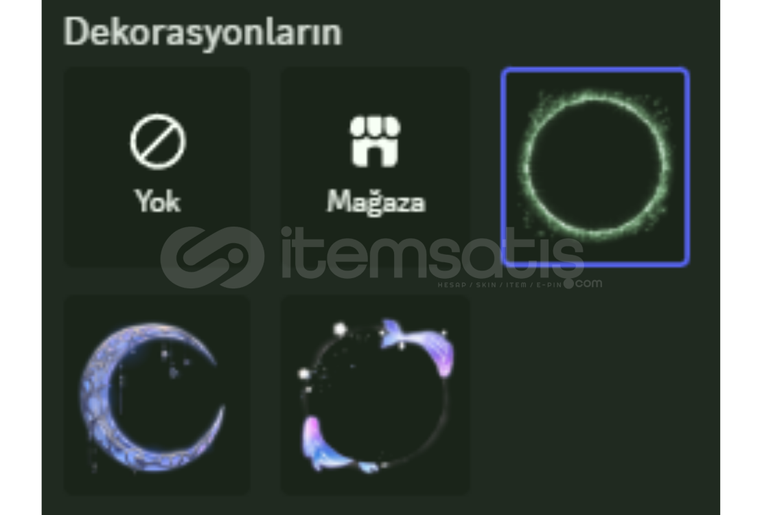 Avatar DekorasyonuIşık, Kamera, Oyun! (Deniz Mavisi)Ay Işığı TılsımlarıYıldız Işığı Balinalarıİsim PlakasıBir Daha! (Deniz Mavisi)Yıldız Işığı BalinalarıAy RuhuProfil EfektiHer Profil Bir Sahnedir (Deniz Mavisi)Ay Işığı KristalleriDerin Dalış400₺ dekorlar + 24 boostlı (1 aylık) sunucu + 1 aylık nitro var hesapta