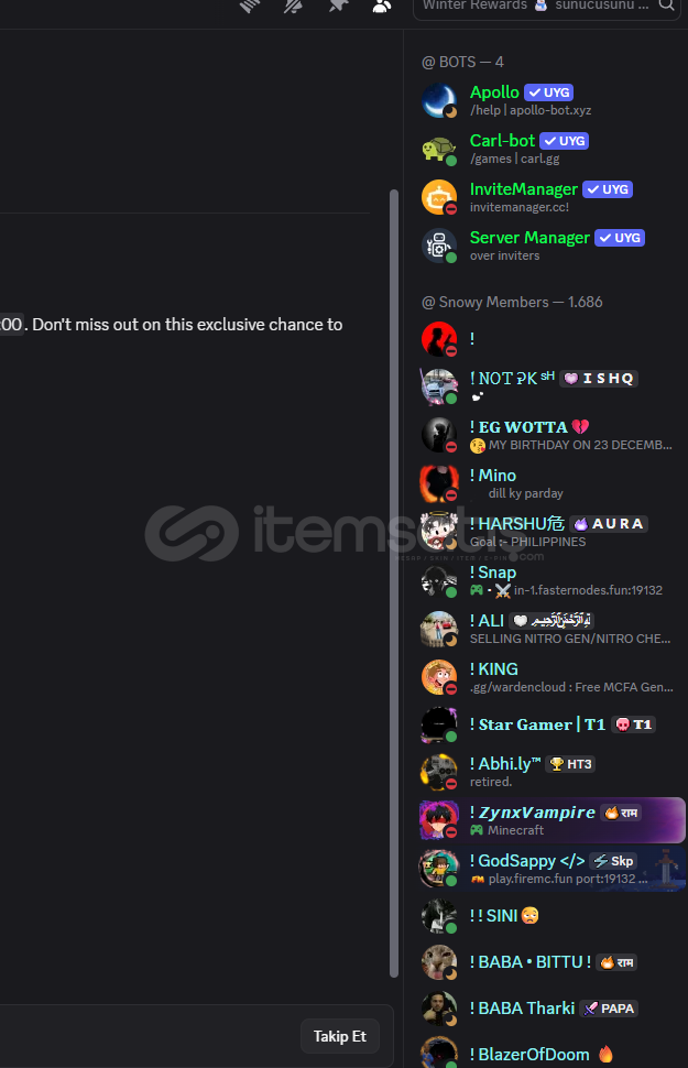 10.000 Üye Paketi – Hizmet AçıklamasıSeçtiğiniz Discord sunucunuza 10.000+ gerçek üye ekleme hizmeti sunuyoruz. Yoğunluğa göre 10.000–11.000 arasında üye teslim edilecek ve herhangi bir düşüş olursa 10.000 seviyesine tekrar tamamlanacaktır.Fiyatlandırma Neden Avantajlı?Sunulan üyeler %100 gerçek insanlardan oluşmaktadır ve garantili hizmet sağlanmaktad&...