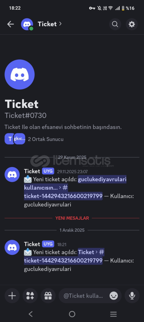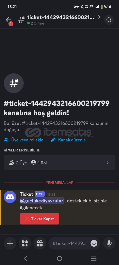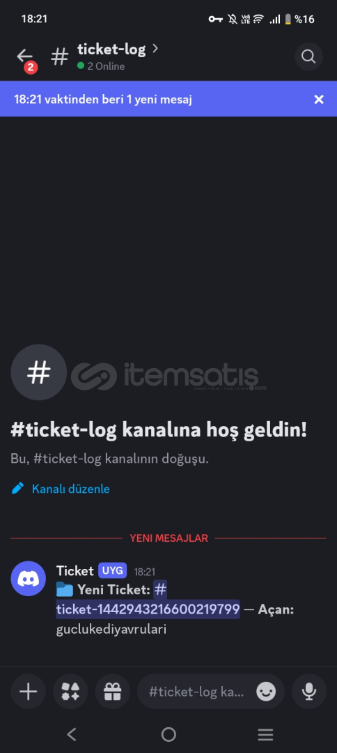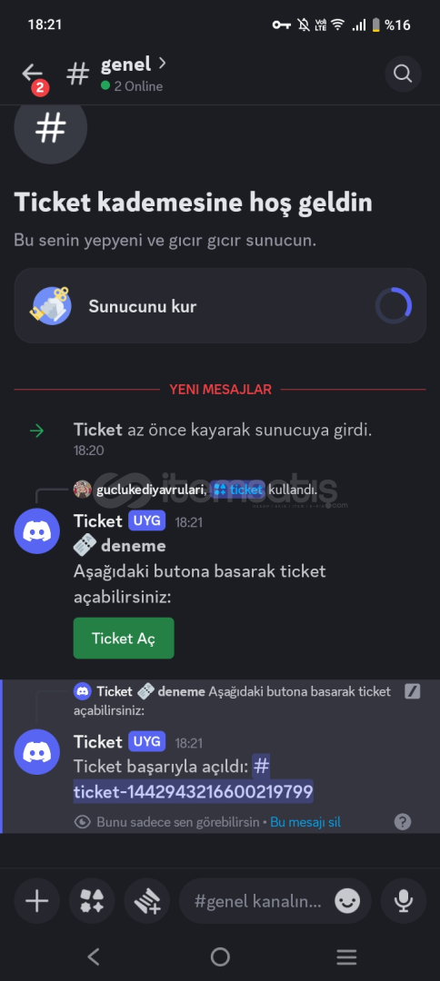 yönetici rolü olanlara otomatik bildirim mesajı ve ticket logu kanalı oluşturma özelliği bulunmaktadır.