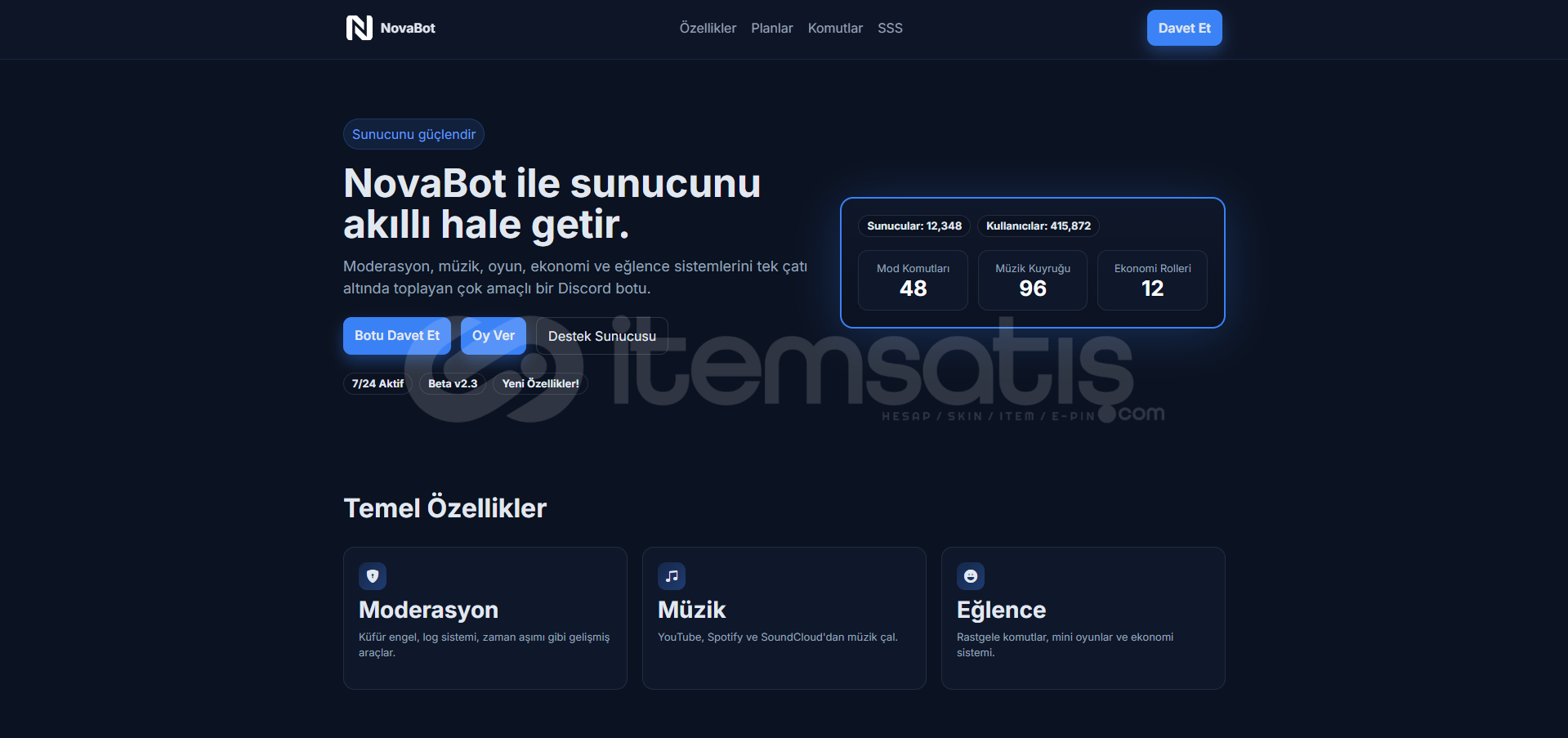 Discord botun için modern ve tamamen özelleştirilebilir bir Landing Page (tanıtım sitesi) şablonu.