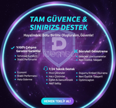 Teslimat ve Destek: Botunuz tamamen hazır ve onaylandığında size teslim ederiz. Botun kurulumu, hosting seçenekleri (isteğe bağlı) ve kullanımı hakkında kapsamlı destek sağlarız. Gelecekteki küçük ayarlamalar veya sorularınız için de yanınızda oluruz.