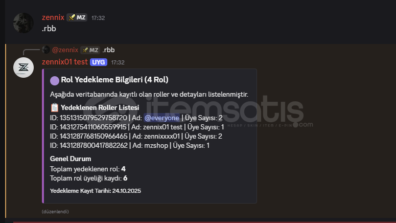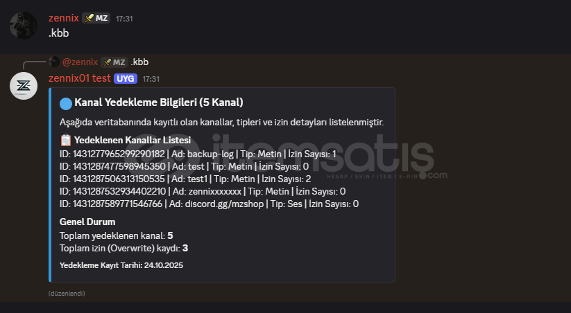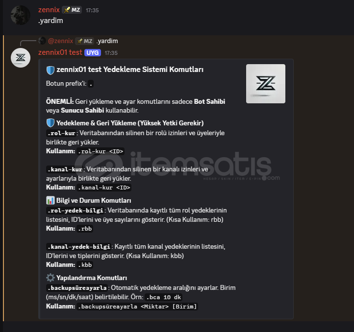 Gelişmiş sunucuyu komple silip tekrar kurabileceğiniz backup botudur.Ayrıltılı bilgi için discord.gg/mzshop.İçerisinde sadece yedekleme sistemi bulunmaktadır.discord.gg/mzshopzennix01