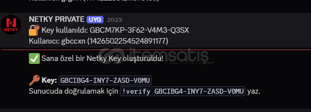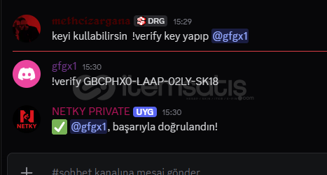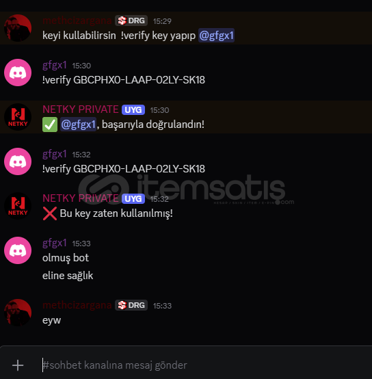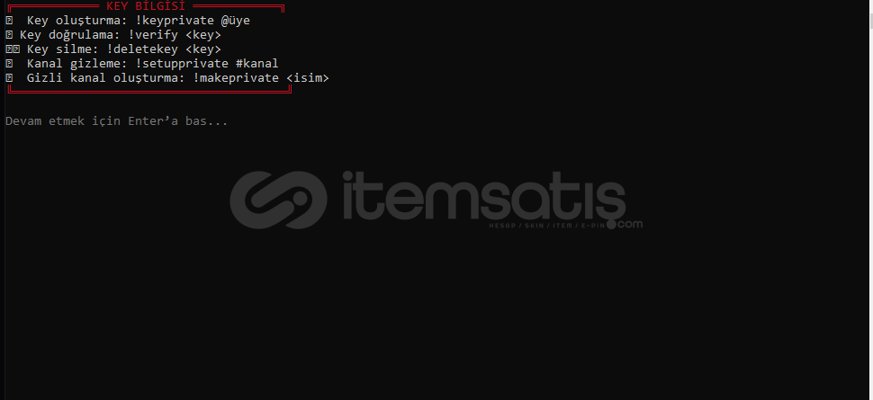 Merhaba bu bot size özel yapılır menü istediğiniz renkte istediğiniz şekilde tasarlanır bütün yazıları herşeyi değiştirebilirim botda keyi 1kişi kullanma hw1d sistemi var 1keyi sadece 1kişi kullabilir istediğiniz şekilde key eklenir mesela atıyorum keyin önüne Netky eklemek isterseniz buda eklenir key kullanılırsa size dmden ve kloserdeki txt dosyasından bildirir dmden ve txt yolu ile herşeyi takip edebilirsiniz şuan kullandığım menü sadece fakat siz isterseniz çok daha iyi bir menü yapabilirim | Komut | Açıklama | Kim Kullanabilir | | ---------------------- | --------------------------- | ---------------- | | !keyprivate @üye | Key oluşturur, üyeye yollar | Admin | | !verify | Üye key girip doğrular | Üye | | !setupprivate #kanal | Kanalı gizler | Admin | | !makeprivate | Yeni gizli kanal oluşturur | Admin | !deletekey (anahtar) bu komutlarla gizli kanal yapıp silebilir key oluşturabilir üye keyi girip doğrulayabilirsiniz