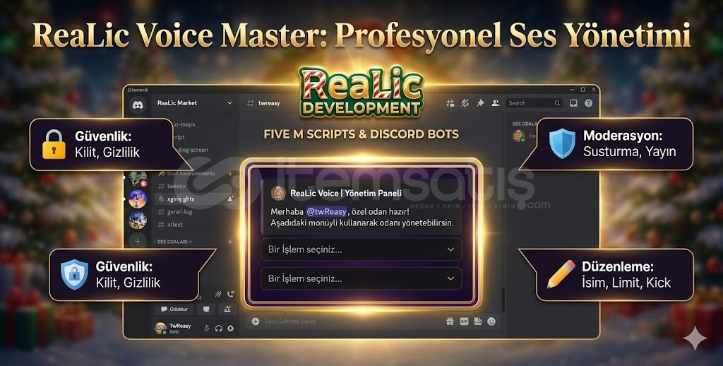 💎 REALIC VOICE MASTER V1 | PROFESYONEL SES YÖNETİM SİSTEMİSunucunuzdaki ses kanalı karmaşasına son verin! ReaLic Market kalitesiyle geliştirilen bu bot, üyelerinize VIP oda yönetimi deneyimi sunar.⚡ NEDEN BU BOTU SEÇMELİSİNİZ?1️⃣ MODERN AÇILIR MENÜ (DROPDOWN) 📱 Eski tip buton kirliliği bitti! Kullanıcılar odalarını şık bir 'Aç...