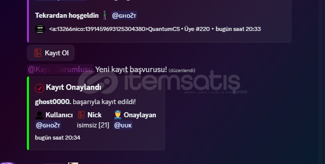 Sunucunuza özel custom kayıt botu yapılır.Hızlıca teslim edilirTamamen sunucuza özel olarak kodlanırDiğer ürünlerim için profilime bakabilirsinizAklınıza takılan her soru için çekinmeden mesaj atabilirsiniz