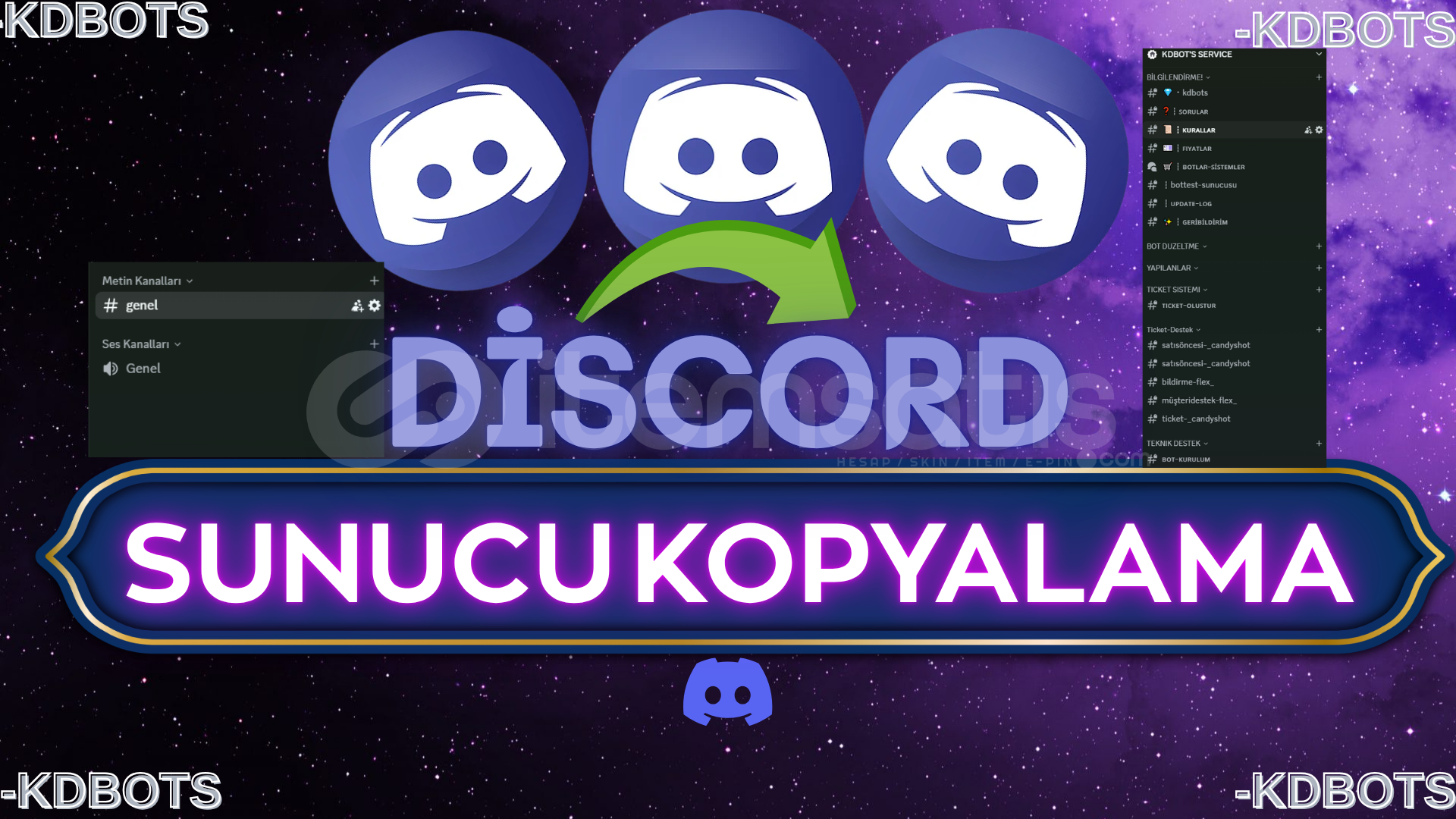 KopyalayabildikleriKanallarıKanal ayarlarıSunucu rolleriSunucu isminiSunucu BannerSunucu ResimSunucu AyarlarınıKurulumu çok basittir. (yapamaz iseniz yardımcı olurum)Satın aldığınızda not defterinde kurulumu yazmaktadır.Eğer uğraşmak istemiyorsanız sizin yerinize sunucu kopyalama işlemi yapıyorum. (20TL)
