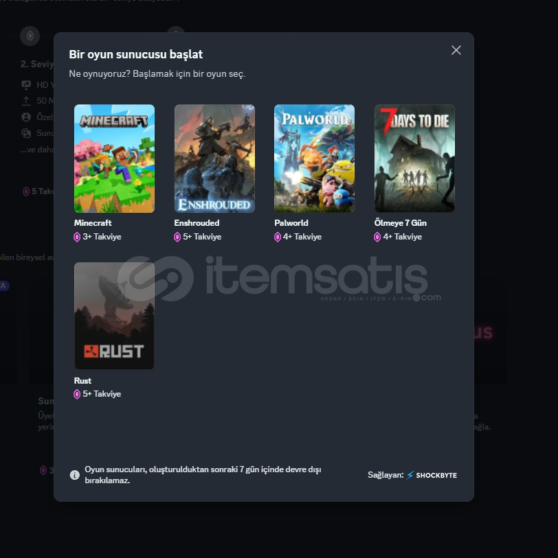 Discordun yeni getirmiş olduğu bizim sizlere vereceğimiz [BETA] ve nadir bulunan sunucularda görselde gördüğünüz oyunlarda boost ile discord üzerinden oyun sunucusu açabilir istediğiniz gibi arkadaşlarınızla discord sunucunuz üzerinden açmış olduğunuz oyun sunucularında rahatça oyun oynayabilirsiniz.Discordun daha yeni getirmiş olduğu beta özelliktir.Oyun sunucusunu ...