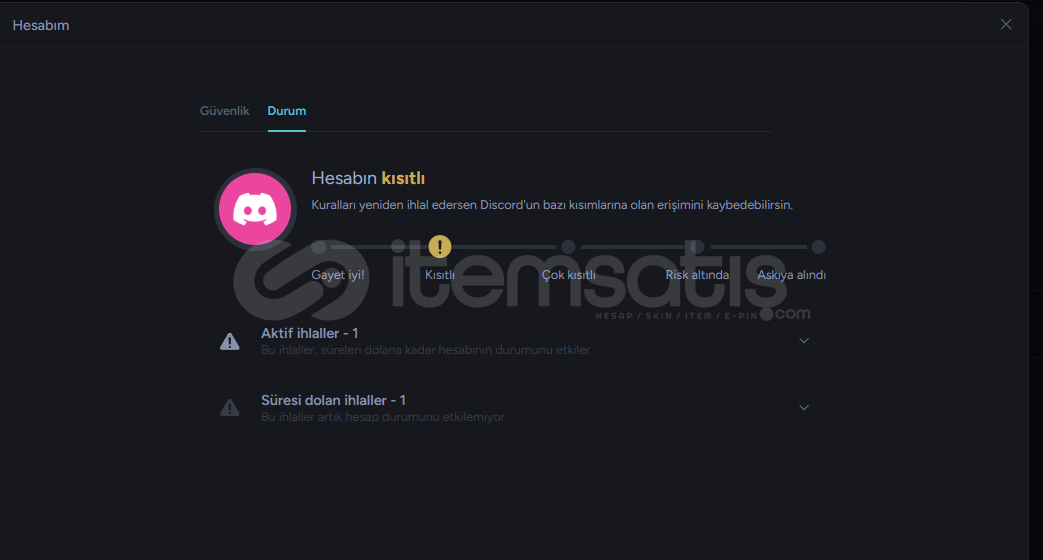 • 1 İhlali vardır önemli bir şey değil silindi zaten sadece hesap durum sekmesinde görünüyor onun dışı hesapta asla herhangi bir legal olmayan işlem konuşma yapılmamıştır öyle ortamlarda bulunulmamıştır bizzat kendi ana hesabım.