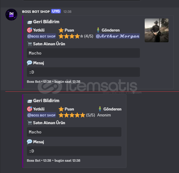 Güvenilirlik: Güv: 10/10 Memnuniyet: Mem: 10/10 İletişim: İlet: 10/10 Teslimat: Tes: 10/10
