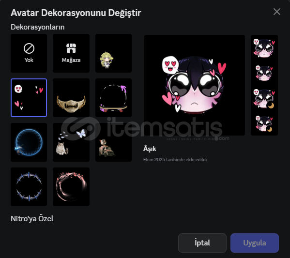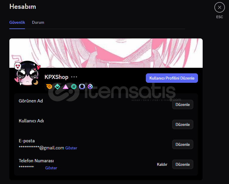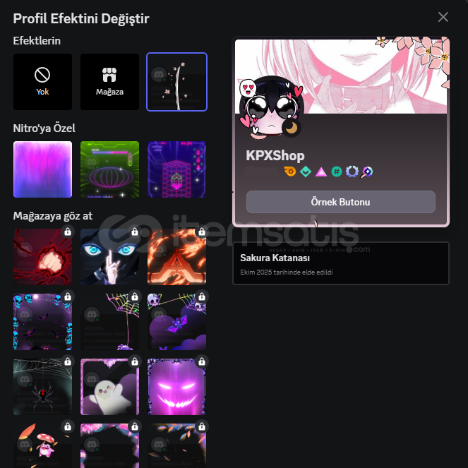 Hesapta:✨ 1 Profil Efekti🏷 1 İsim Plaketi🎭 9 Avatar Dekorasyonu var.⚠ Dikkat:📧 Mail değişecek📩 Almadan önce satıcı ile iletişime geçin