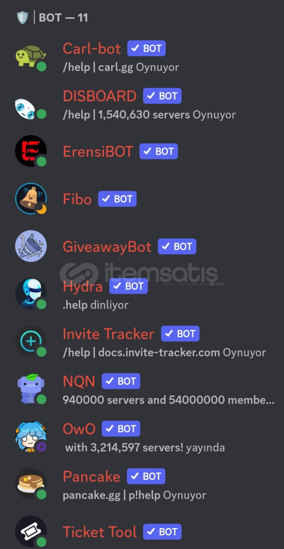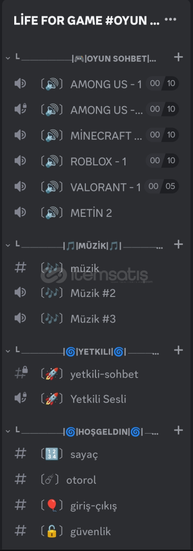 Sunucudaki Kanal roller ve rol ayarları tamamen hazırdır.Sunucuyu isterseniz kendiniz kullanın.Sunucuyu aldığınızda hemen size teslim edilir.Sunucu OYUN sunucusu olduğu için çok kolay bir şekilde üye çekebilirsiniz.Sunucuda hiç üye yoktur şablon sunucusudur.Sunucuya üye gelmesi için sunucuda DİSBOARD BOT vardır o bot sayesinde sunucuya üye çekebilirsiniz.Sunucuyu aldığnız gibi kullanmaya başlayabilirsiniz.Sunucudaki bütün botlar çalışmaktadır.Bizi tercih ettiğiniz için herkes teşekkürler....