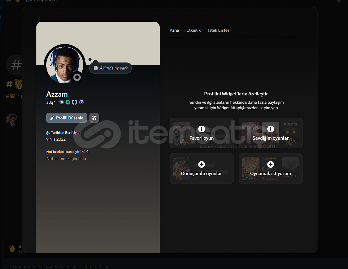 4 HANE + 2019 KURULUM DISCORD HESAPÜrünü tamamen direkt teslimattır.ÜRÜN HAKKINDA BİLGİLERHesap 2022 kurulumdur.Hesapta boost rozeti suanda yoktur. O yüzden 4 rozettirTelefon ile doğrulanmamıştır.Herhangi bir problem yaşanmaması için satın alırken video kaydı almanız gerekmektedir.Bu ilanı satın aldıktan sonra bu açıklamayı...